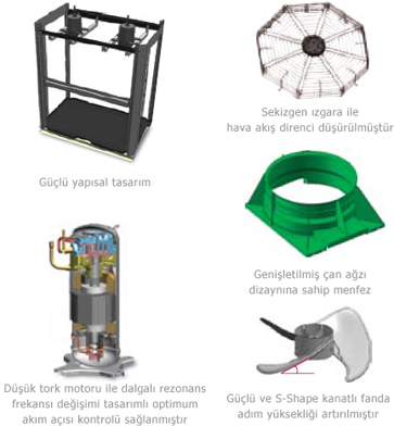 teknolojisi, dış ünite fanları ve yeni geliştirilen hava çıkış menfezi sayesinde minimize edilmiştir. |